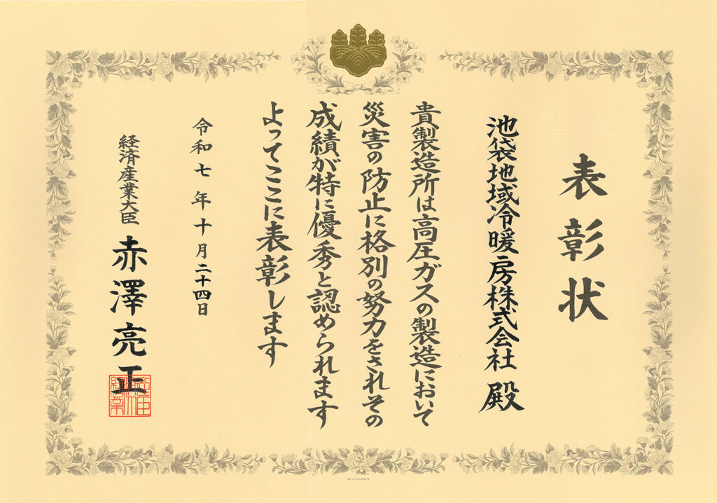 この度、弊社は優良製造所(⾼圧ガスの製造における各施設の構造、設備及び製造⽅法に関し、保安上の措置が特に優れている等の事業所)として高圧ガス保安経済産業大臣賞を受賞しました。
