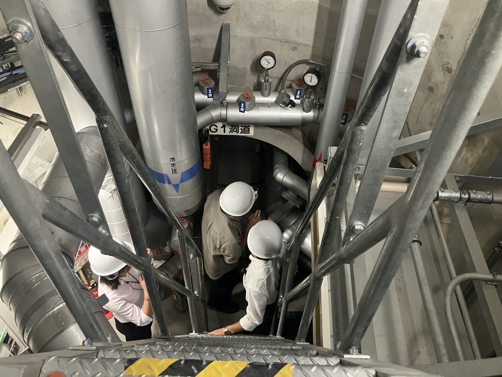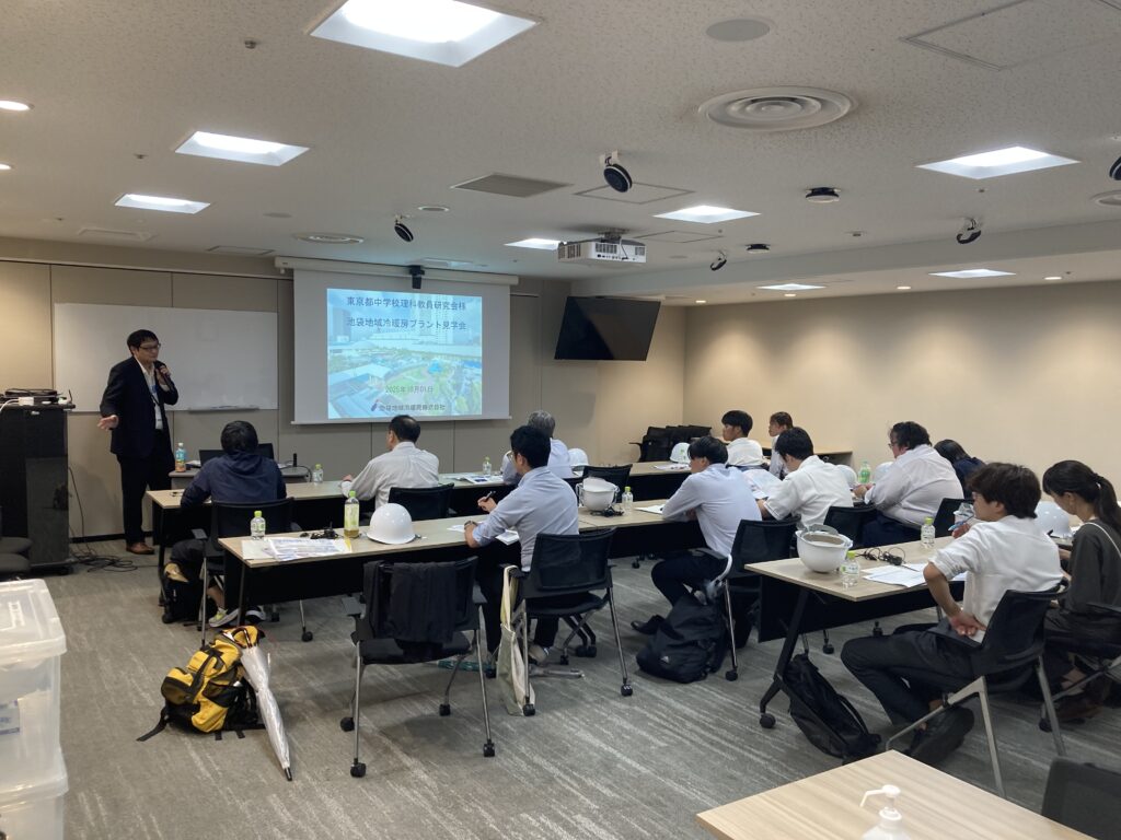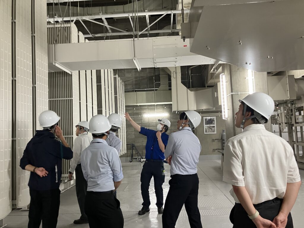 当日は、当社社員から会社紹介や熱供給事業の説明、将来的な未利用エネルギー活用に向けた取組みの紹介をしました。プラント見学では、冷凍機・ボイラー等の熱源設備、導管・洞道をご案内しました。